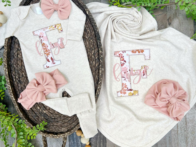 Personalized Baby Girl Outfit | Oatmeal Knotted Gown Floral Pink Gold - style: ElizabethGown
