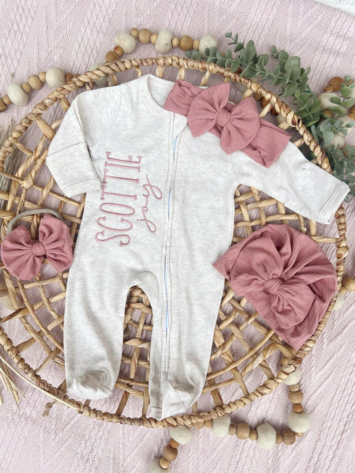 Personalized Baby Girl Newborn Outfit | Oatmeal Zip Romper Custom Color Baby Name