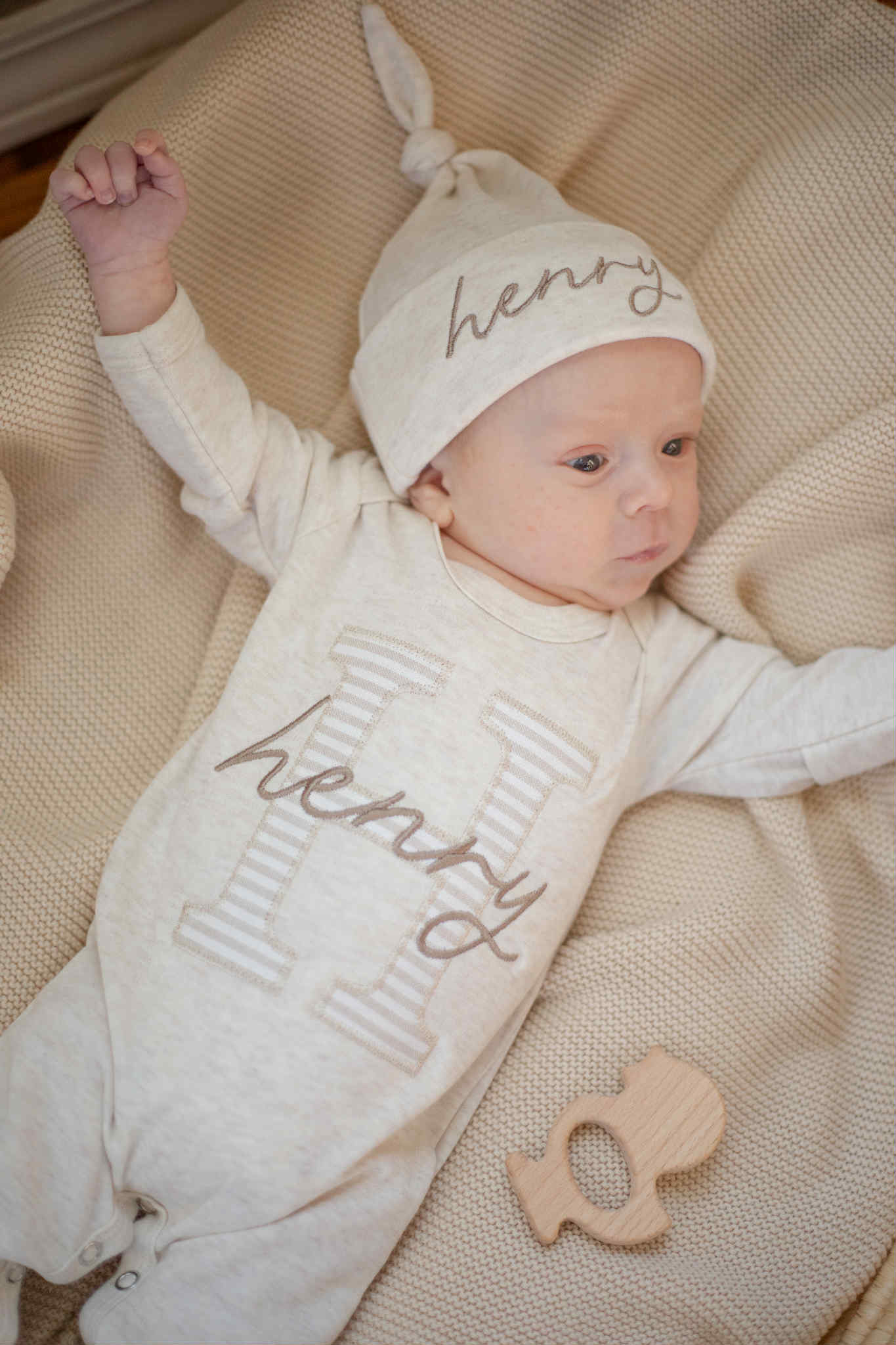 This outfit makes a perfect coming home outfit, newborn pictures, or baby shower gift. This sweet sleeper is soft and comfortable to snuggle a little one. This features a soft oatmeal romper, a large initial in a handsome beige stripe, with name in a handsome taupe across the front. You can also choose to add a hat to finish off this cute baby outfit.