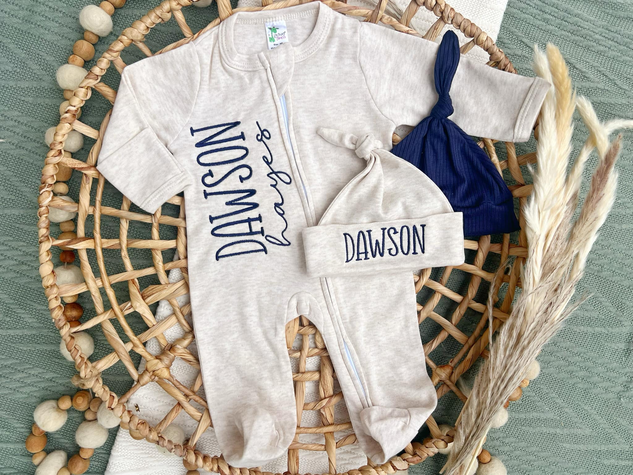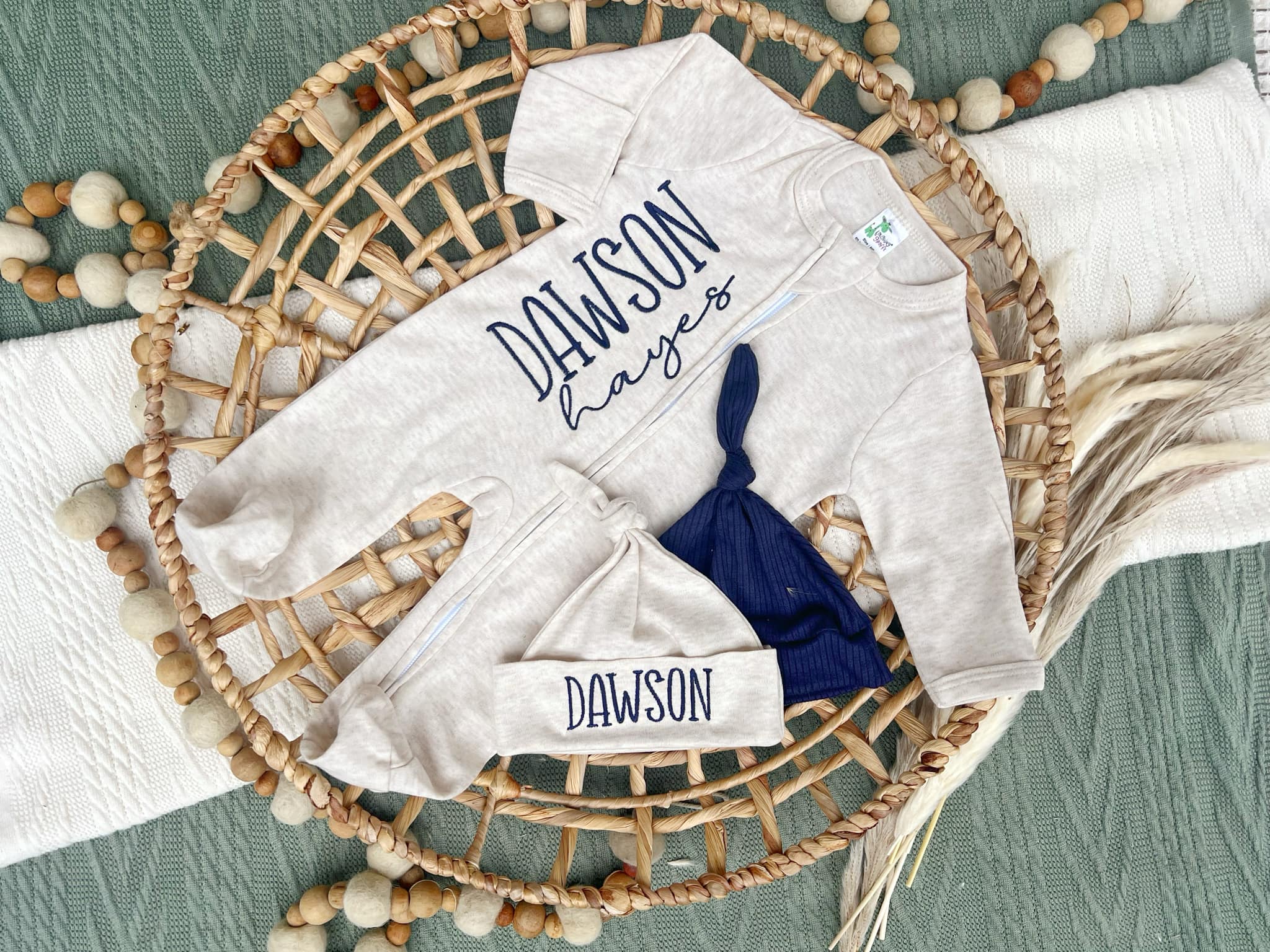 This outfit makes a perfect coming home outfit, newborn pictures, or baby shower gift. This sweet sleeper is soft and comfortable to snuggle a little one. This features a soft oatmeal romper, with name in a color you choose down the front. You can also choose to add a hat to finish off this cute baby outfit.