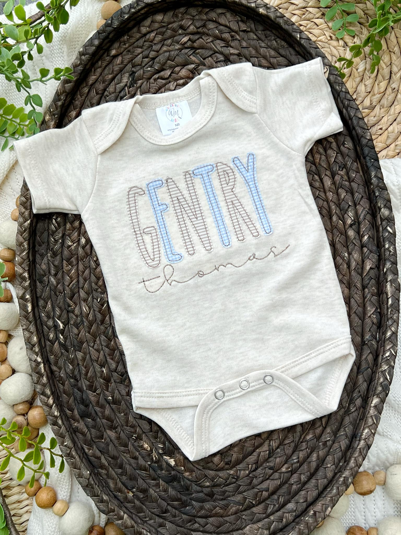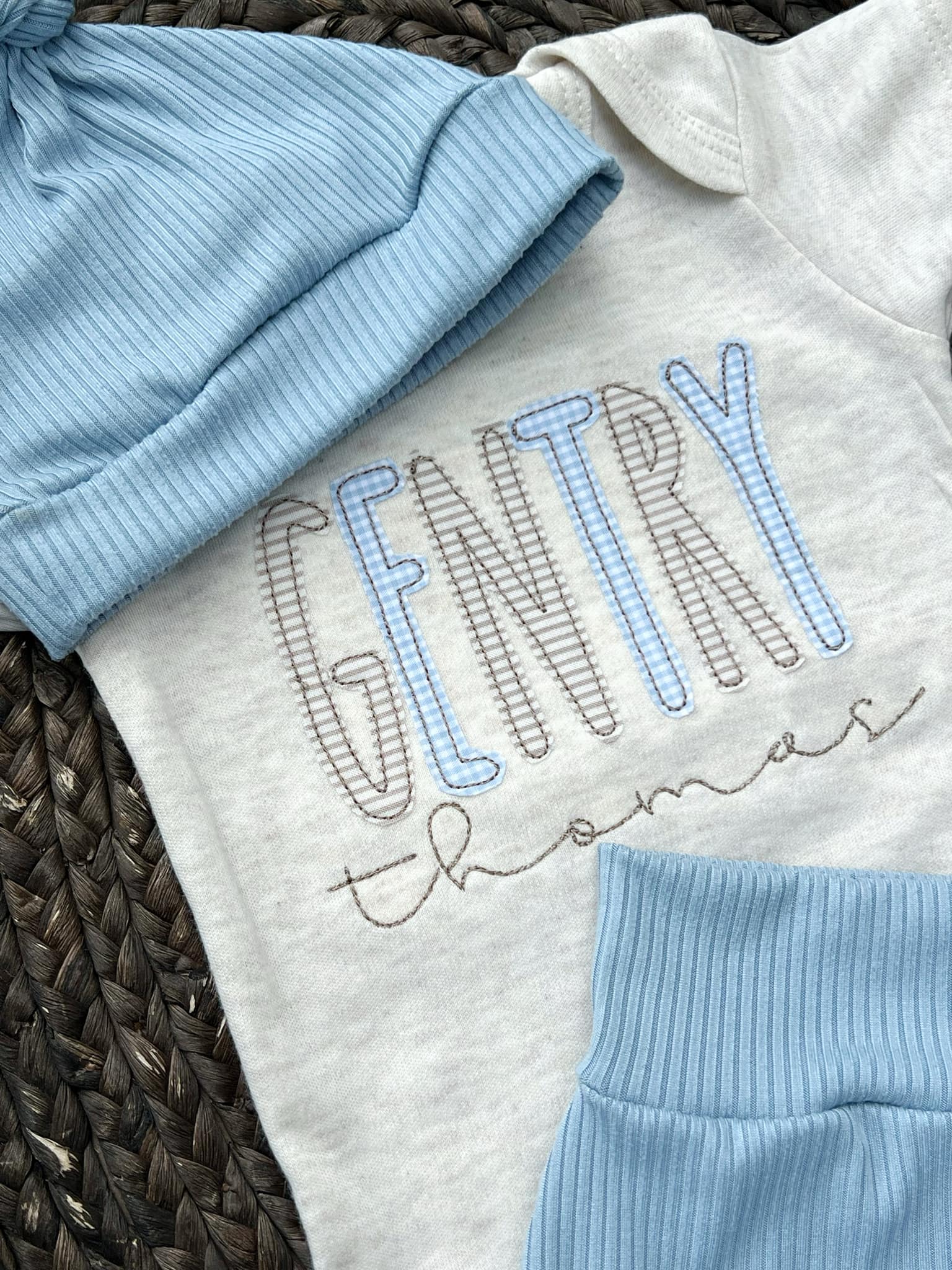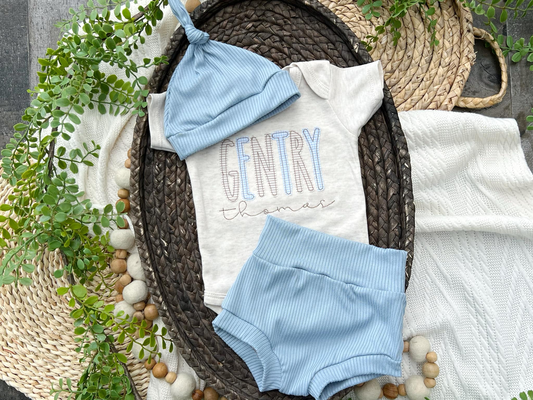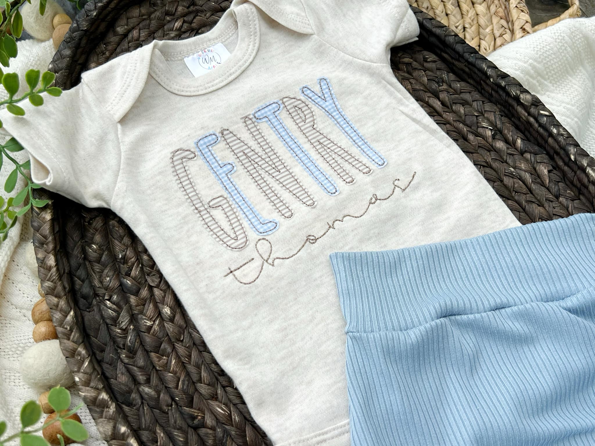 This outfit makes a perfect coming home outfit, newborn pictures, or baby shower gift. This sweet sleeper is soft and comfortable to snuggle a little one. This features a soft oatmeal bodysuit with the first name in soft blues and middle name in soft brown across the front . You can also choose to add matching pants or bummies to finish off this cute baby outfit.