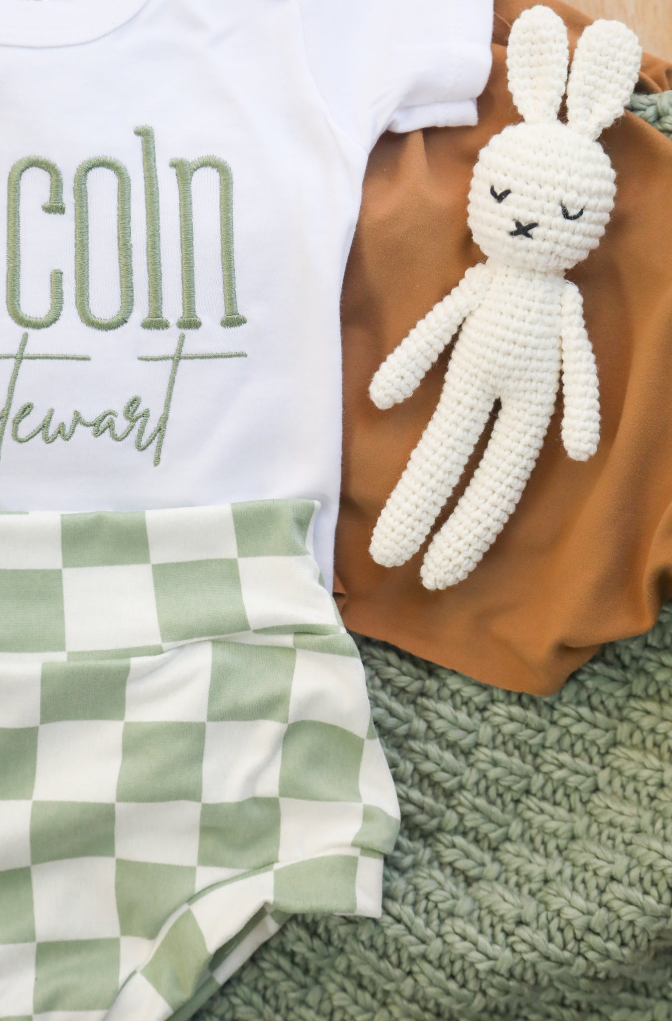 This outfit makes a perfect coming home outfit, newborn pictures, or baby shower gift. This sweet sleeper is soft and comfortable to snuggle a little one. This features a soft white bodysuit with the first name in a green name across the front and a cute checkers for bummies.