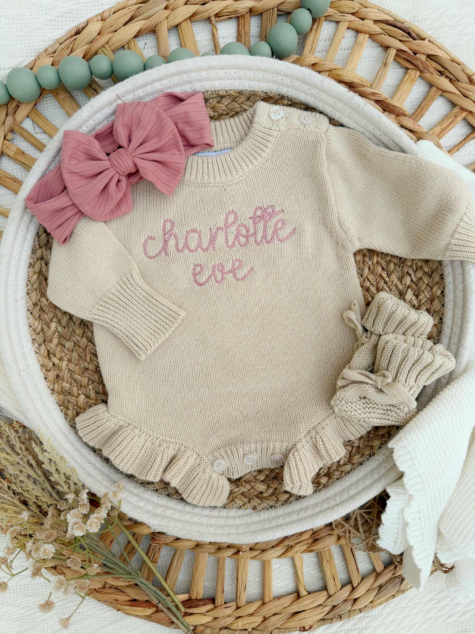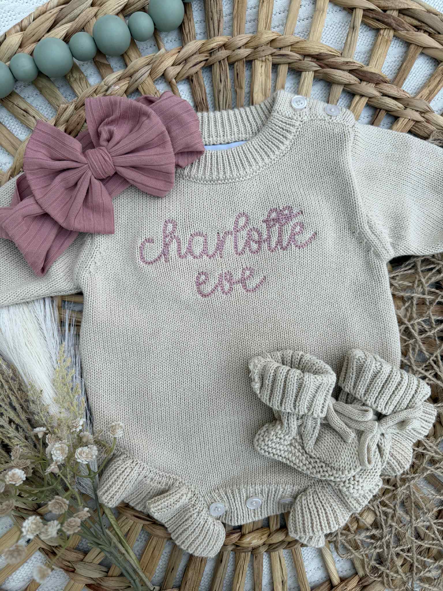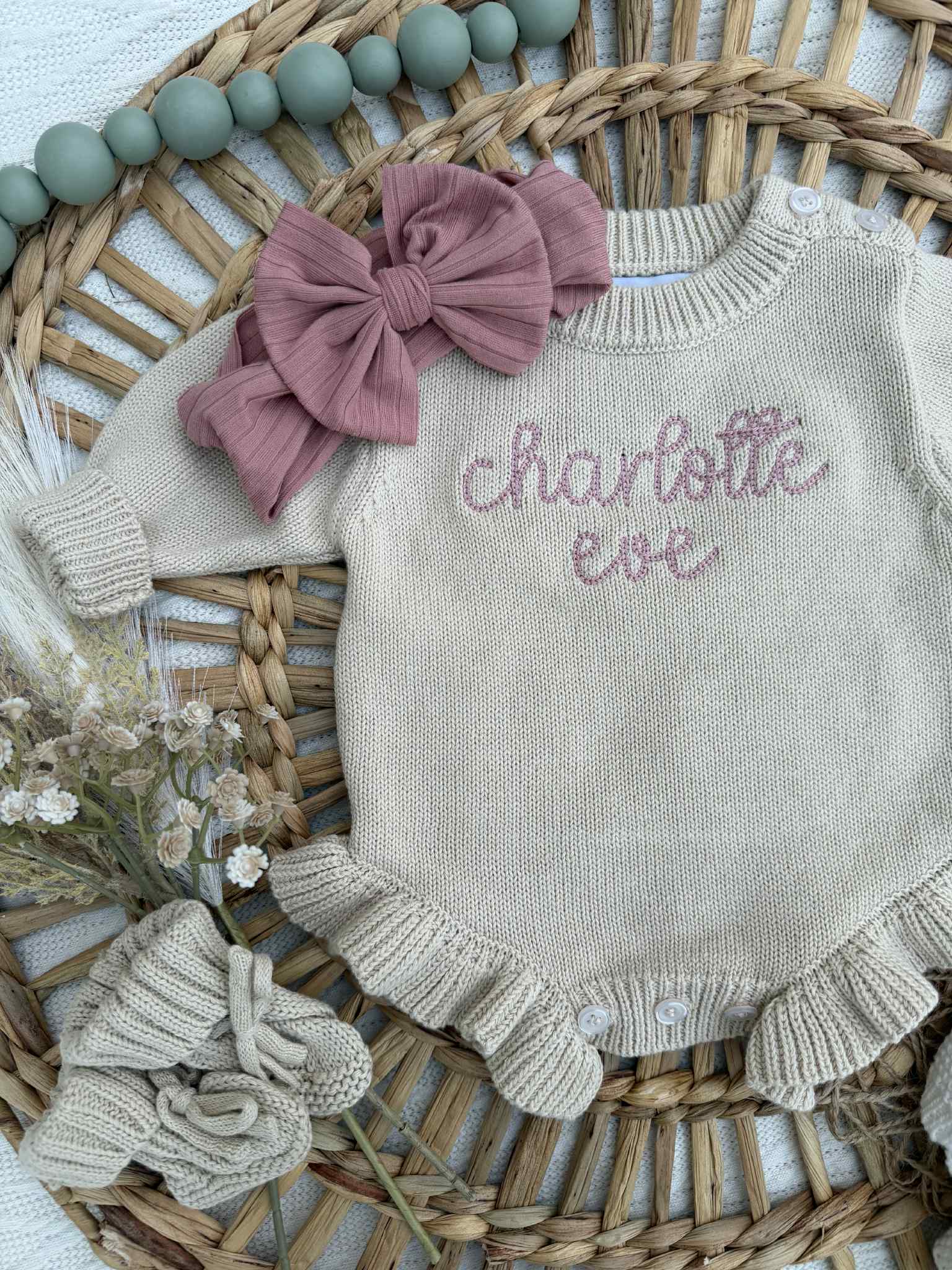 This outfit makes a perfect coming home outfit, newborn pictures, or baby shower gift. This sweet outfit is soft and comfortable to snuggle a little one. This features a soft oatmeal sweater romper, with name in a color you choose across the front. You can also choose to add a bow, headwrap, or turban to finish off this cute baby outfit.