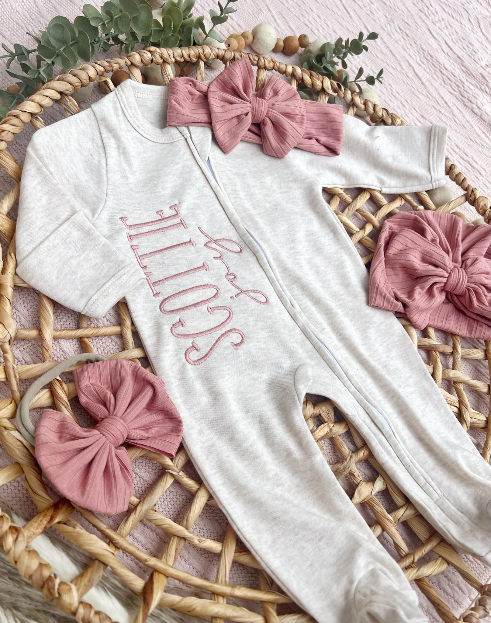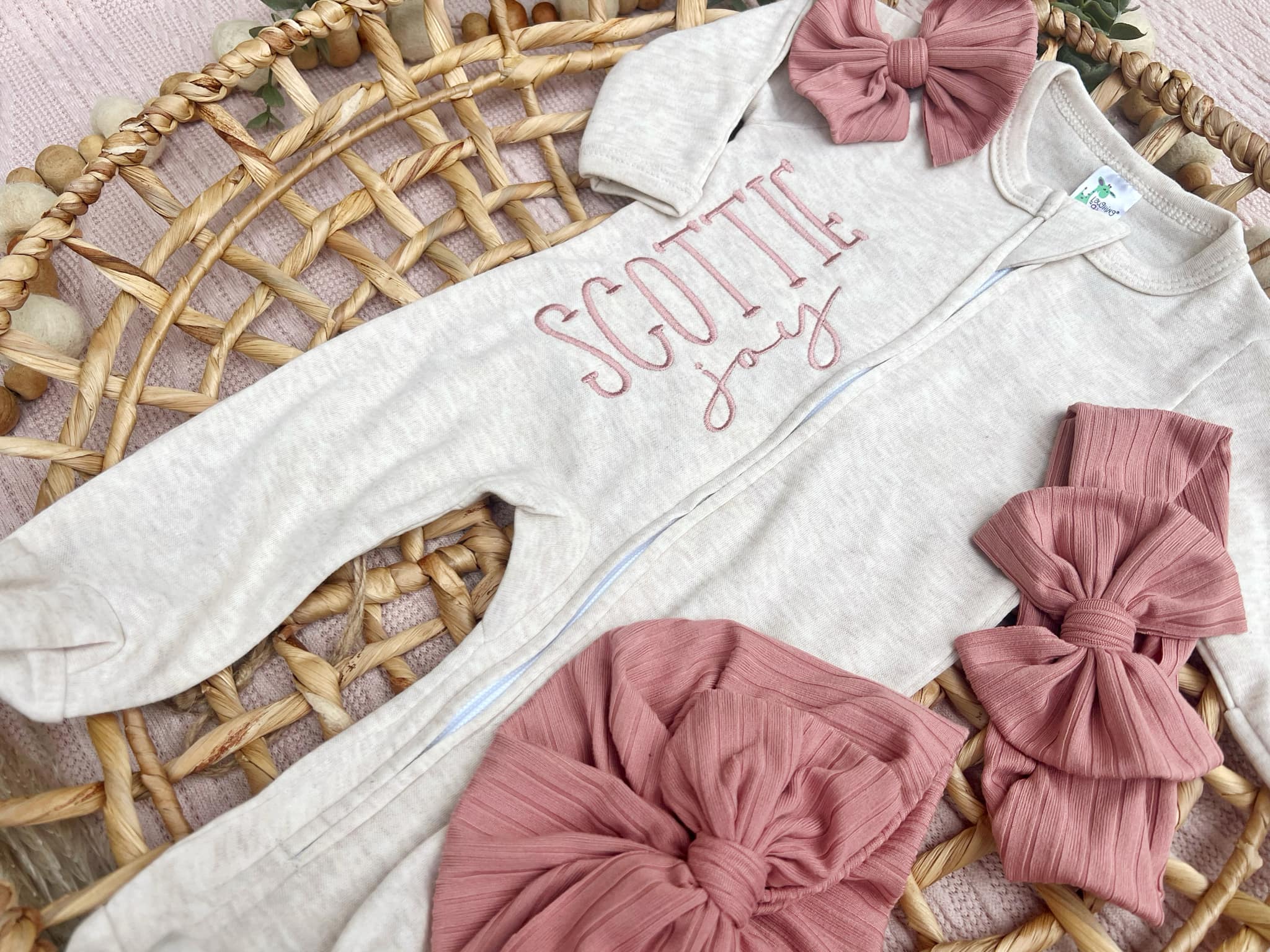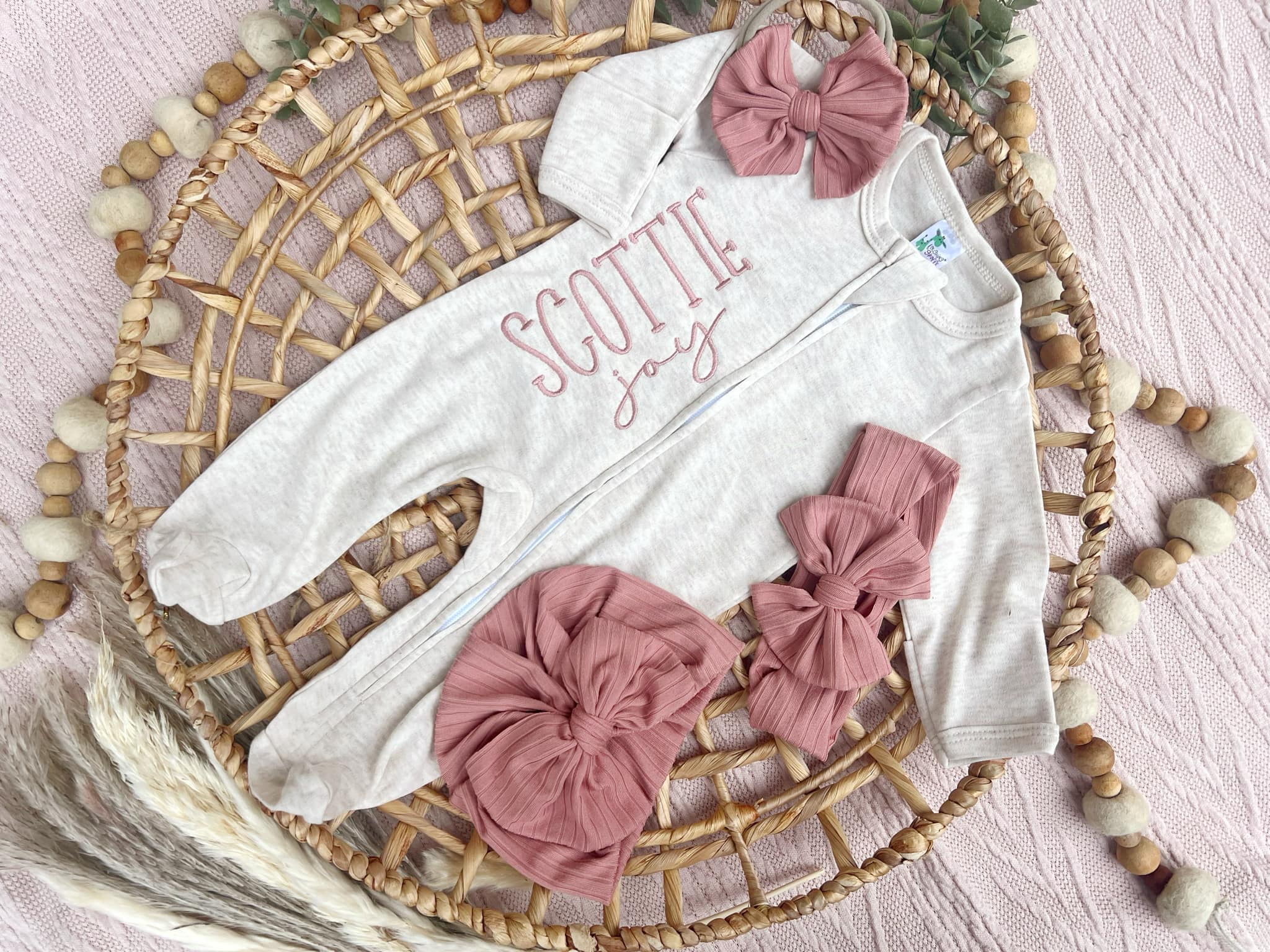 This outfit makes a perfect coming home outfit, newborn pictures, or baby shower gift. This sweet sleeper is soft and comfortable to snuggle a little one. This features a soft oatmeal romper, with name in a color you choose down the front. You can also choose to add a bow, headwrap, or turban to finish off this cute baby outfit.