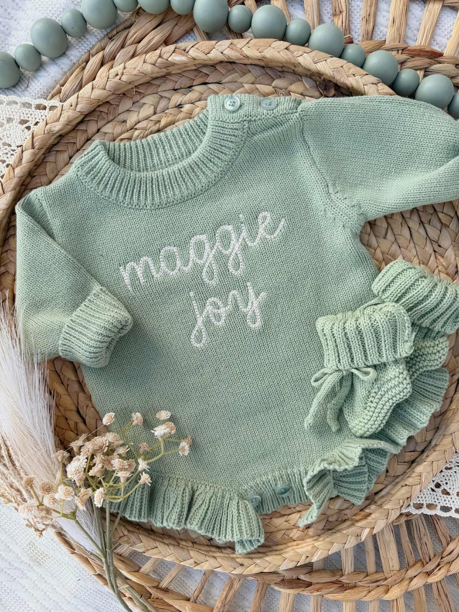 This outfit makes a perfect coming home outfit, newborn pictures, or baby shower gift. This sweet outfit is soft and comfortable to snuggle a little one. This features a soft green sweater romper, with name in a color you choose across the front. You can also choose to add booties, a bow, headwrap, or turban to finish off this cute baby outfit.