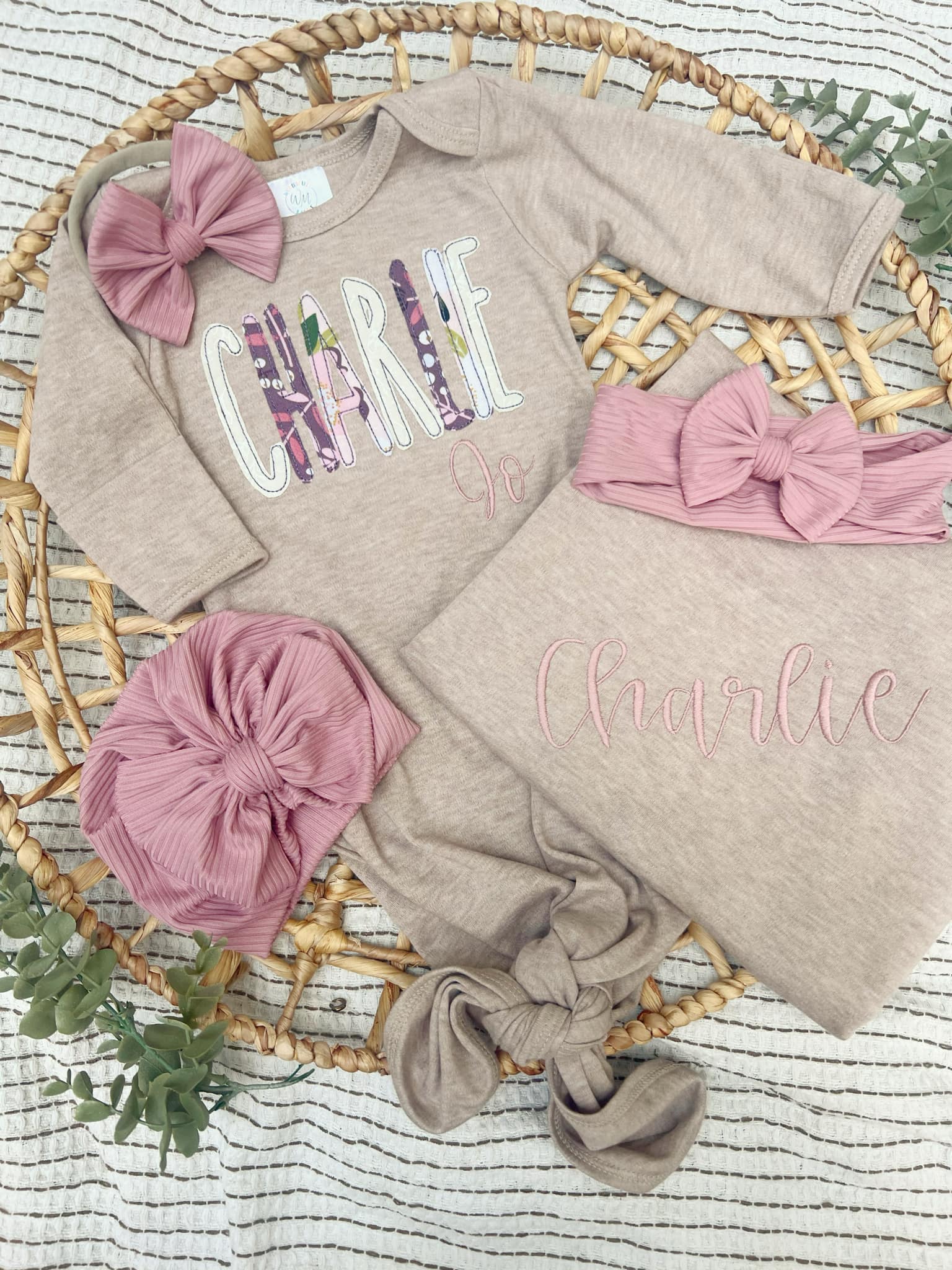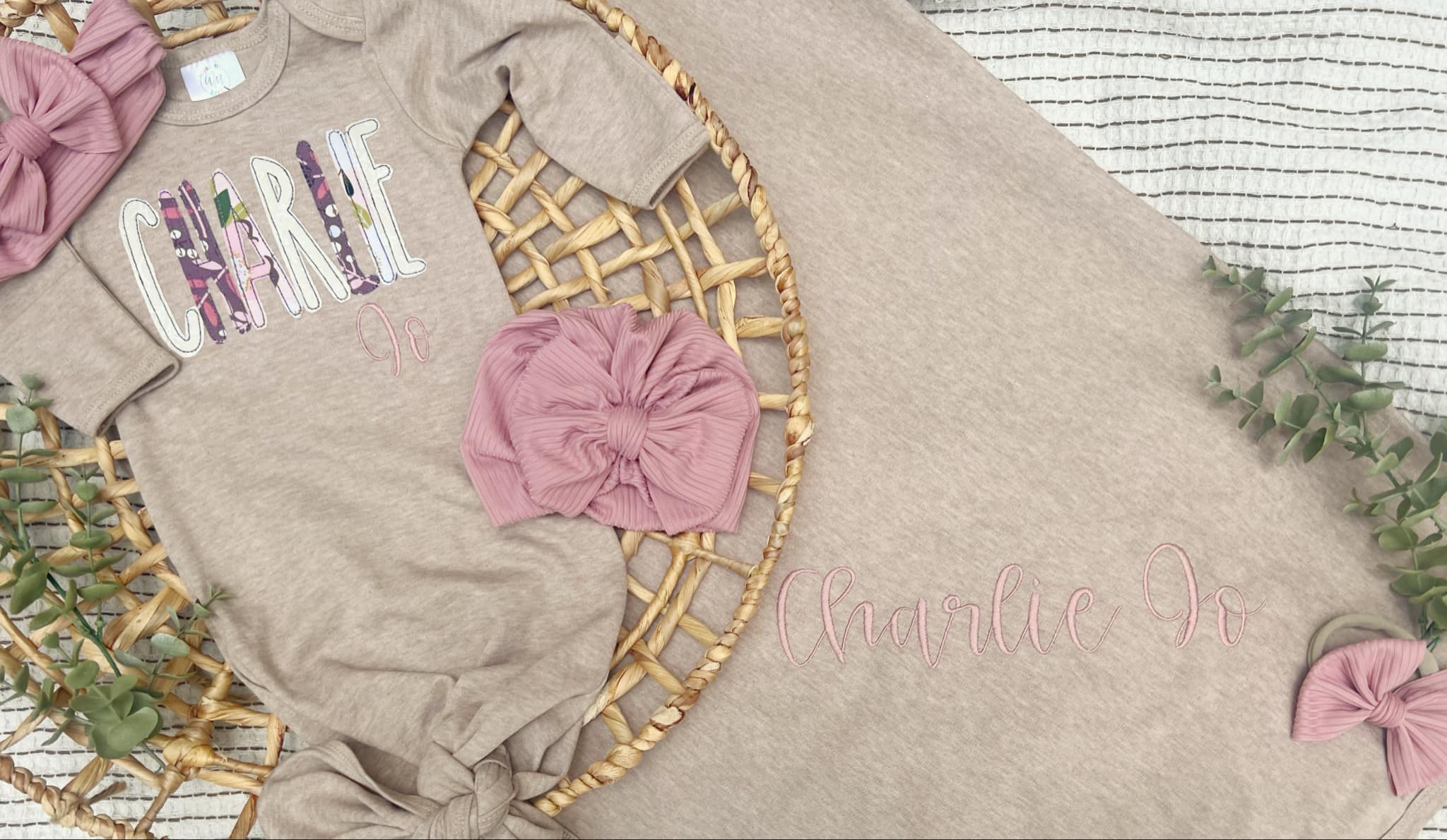 This outfit makes a perfect coming home outfit, newborn pictures, or baby shower gift. This beautiful baby set is so uniquely precious. It features a first name stitched in varying patterns and shades of purple, pinks, creams and florals.