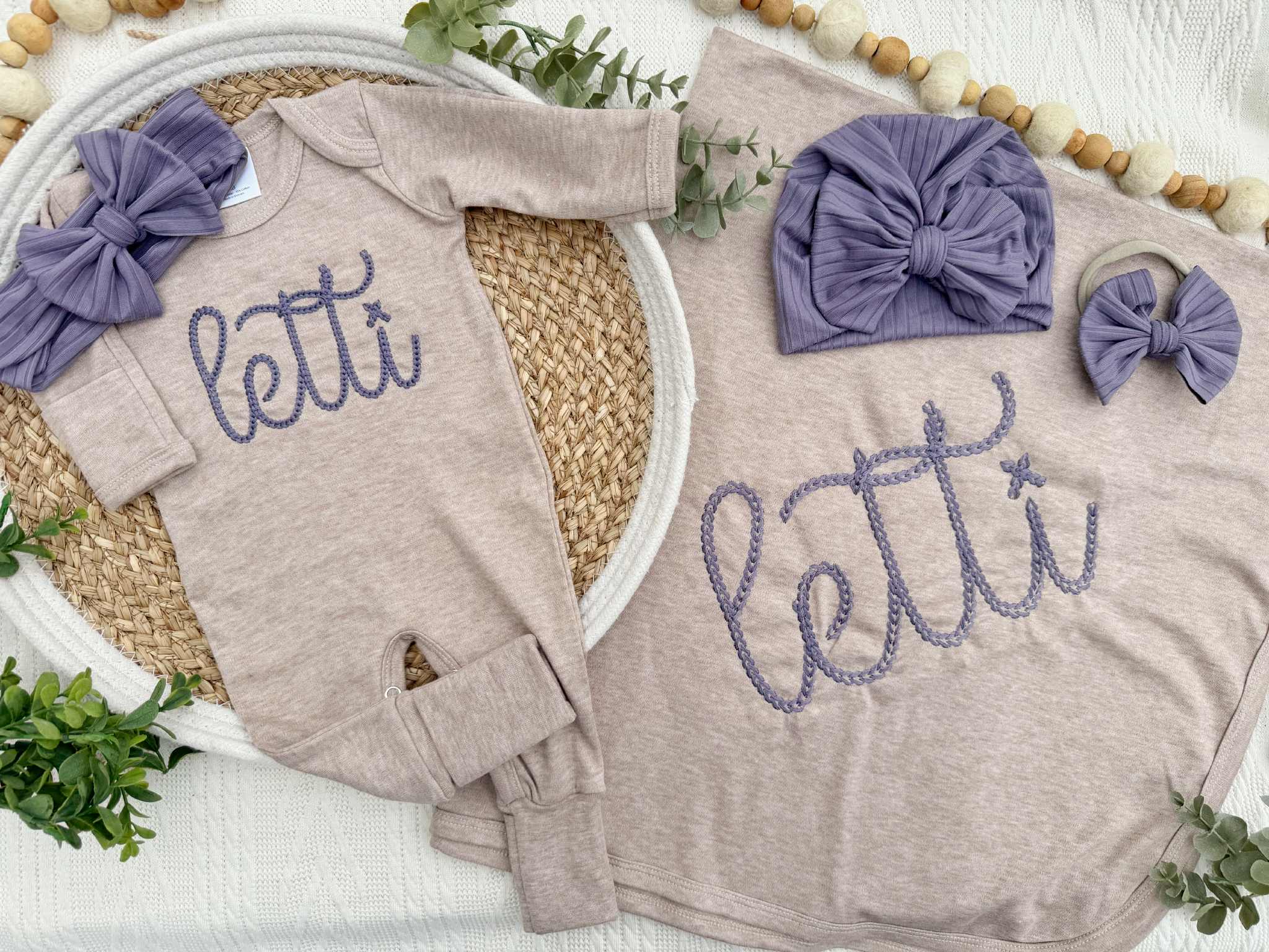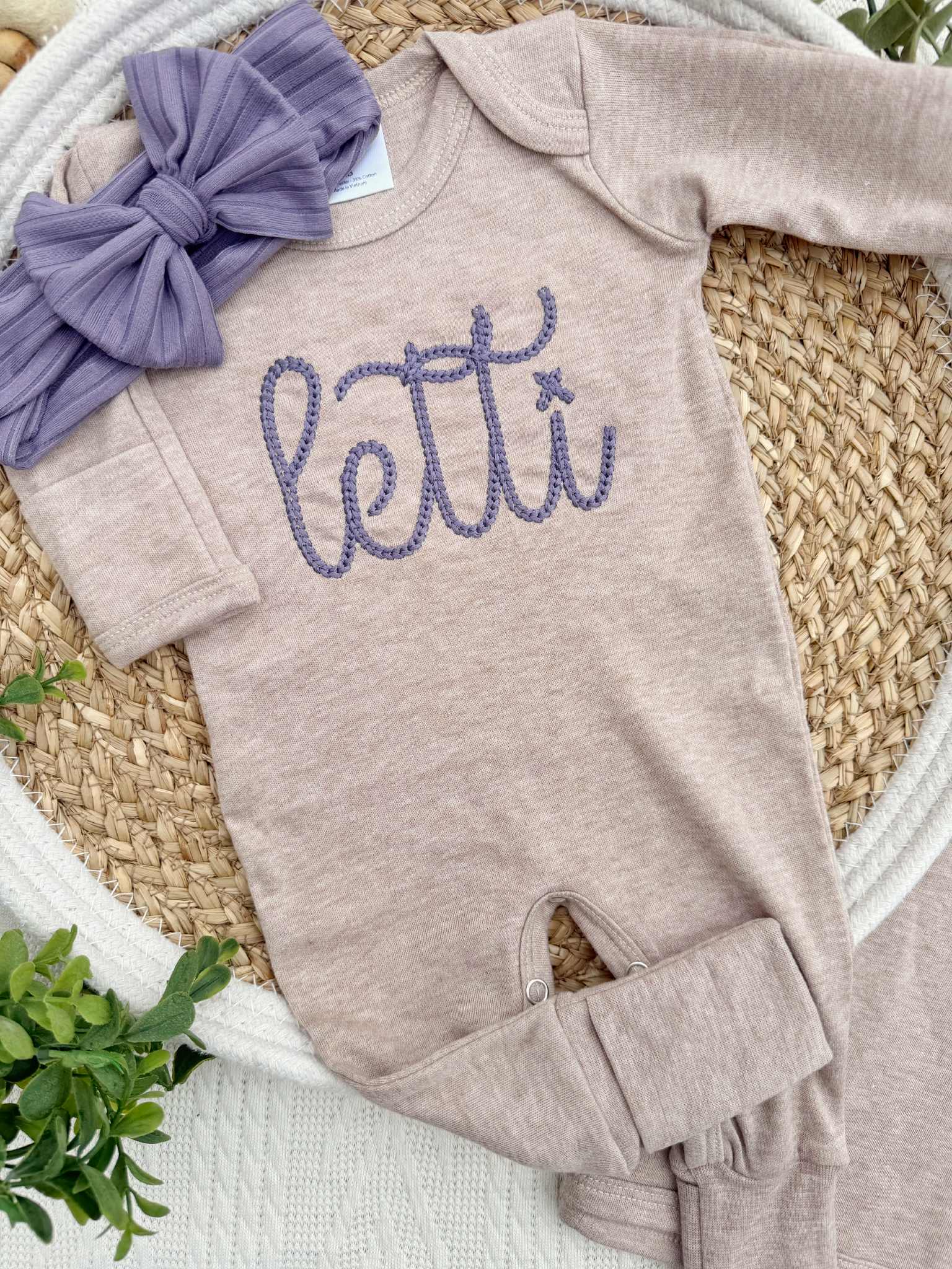 This sweet personalized baby sleeper is soft and comfortable to snuggle a little one. This custom outfit makes a perfect coming home outfit, newborn pictures, or baby shower gift. This features a soft mocha brown romper with a beautiful chunky chain stitch baby name.