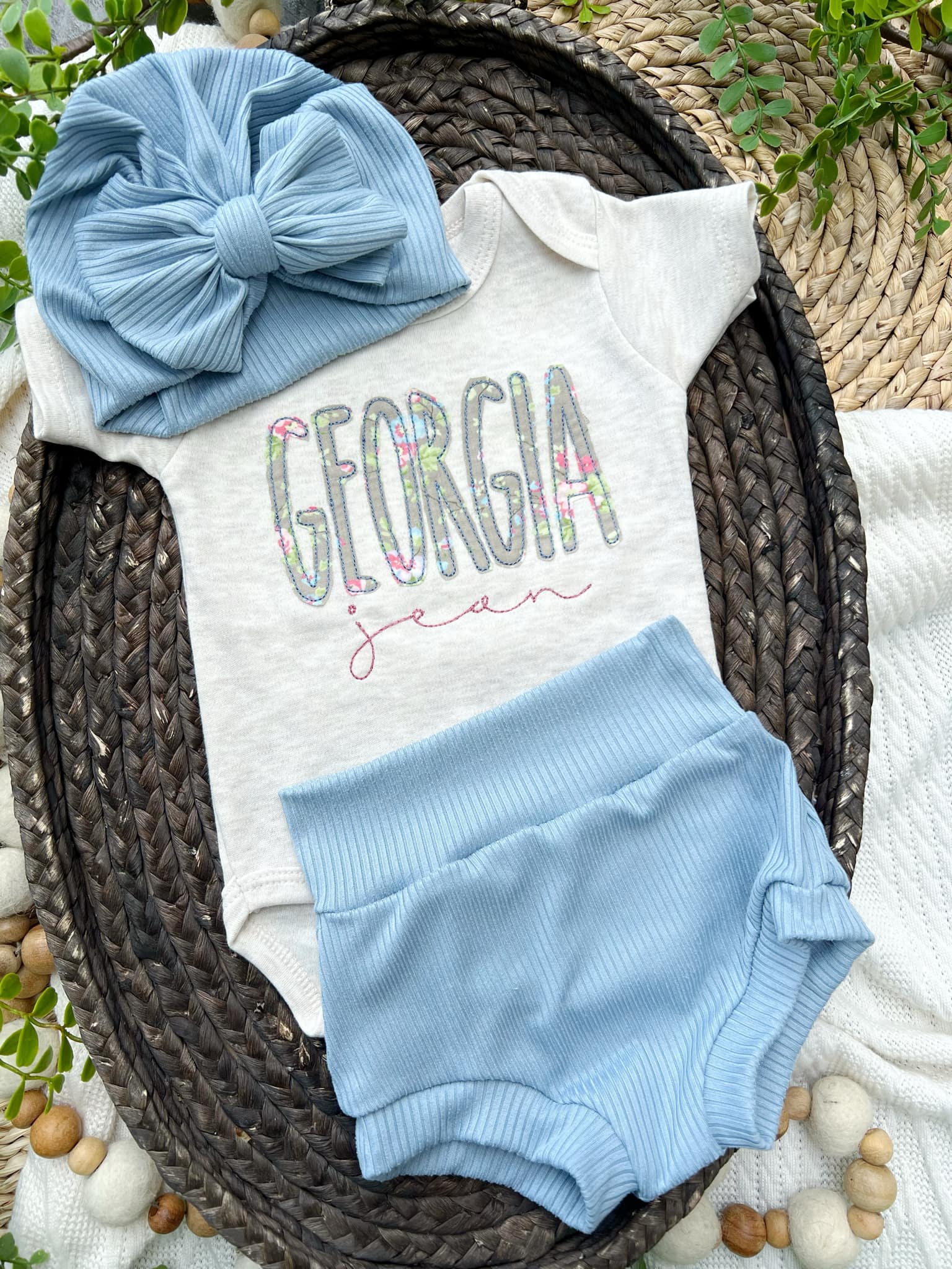 This is a perfect outfit for fall, winter, spring, or summer, a coming home, birthday parties, and baby shower gifts. What a beautiful little outfit! This outfit has a short or long sleeve oatmeal bodysuit with and matching name in a beautiful floral. Mix and match your favorite pieces to make the outfit you want with bummies, bow or turban.