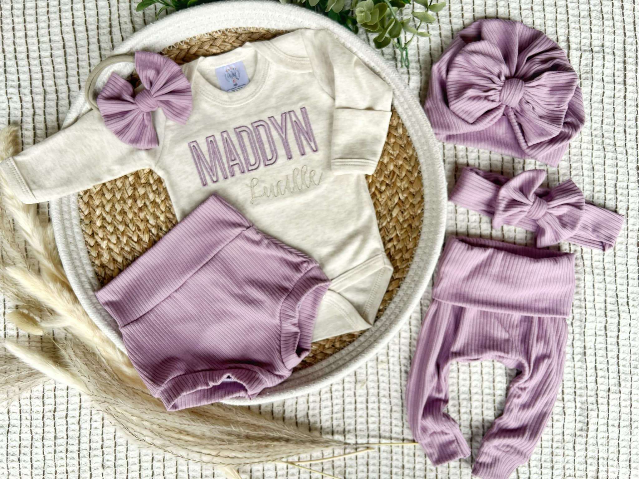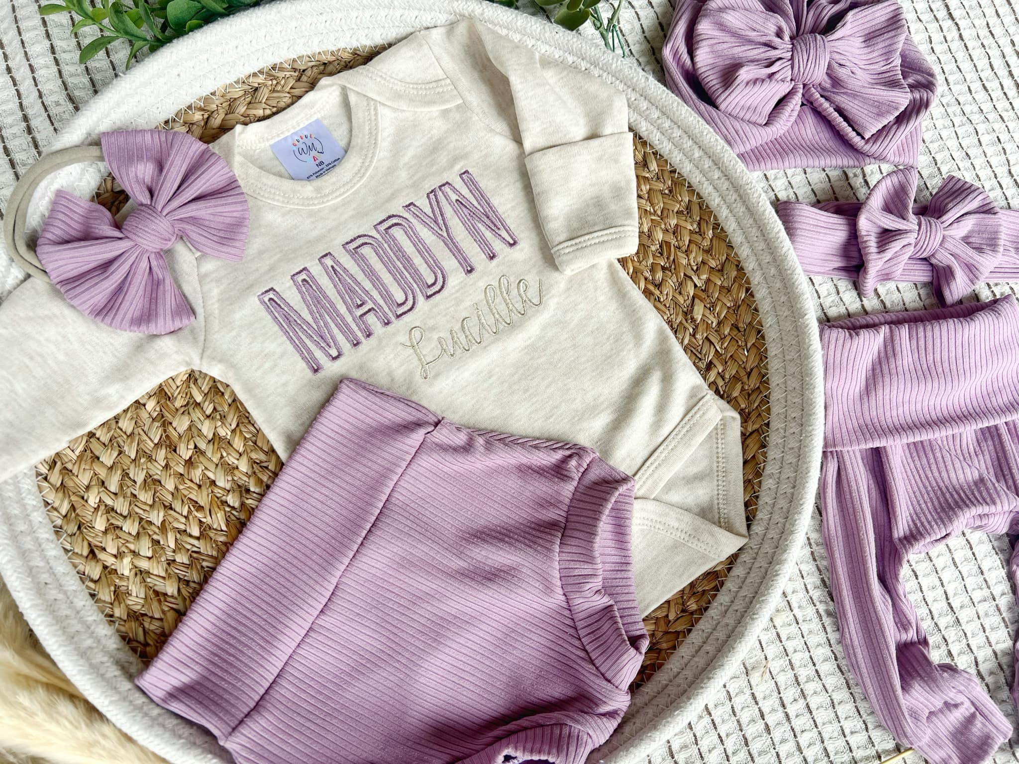 This is a perfect outfit for fall, winter, spring, or summer, a coming home, birthday parties, and baby shower gifts. What a beautiful little outfit! This outfit has a short or long sleeve oatmeal bodysuit with and matching name in a beautiful light purple. Mix and match your favorite pieces to make the outfit you want with bummies, pants, or bow or turban.