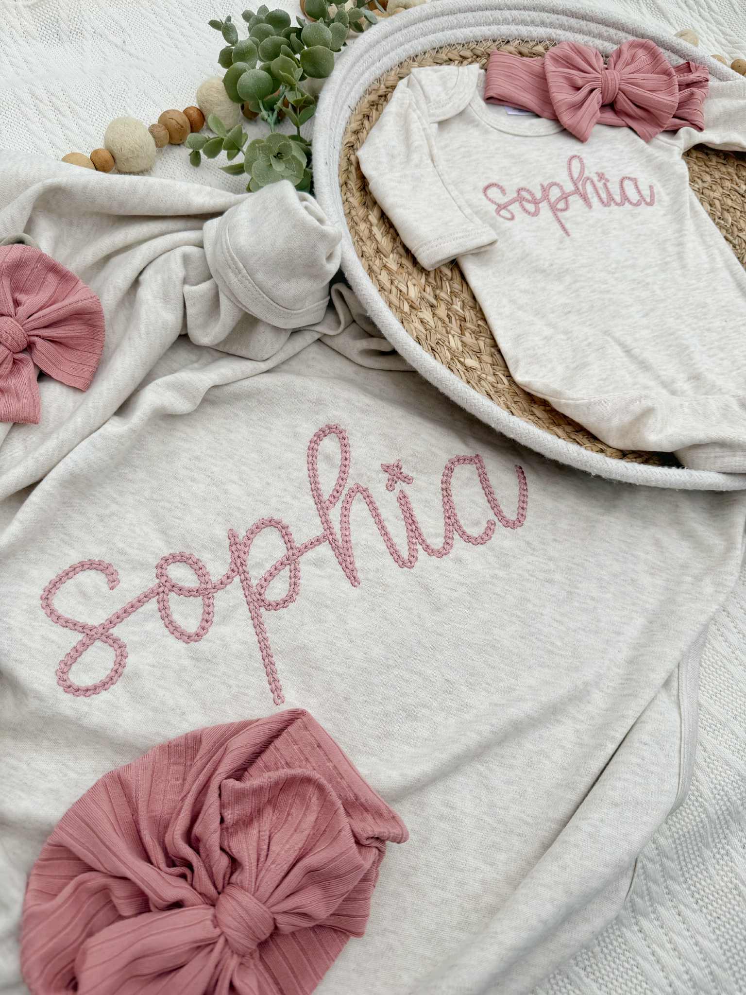 This sweet personalized baby sleeper is soft and comfortable to snuggle a little one. This custom outfit makes a perfect coming home outfit, newborn pictures, or baby shower gift. This features a soft oatmeal romper with a soft pink chunky chain stitch baby name.