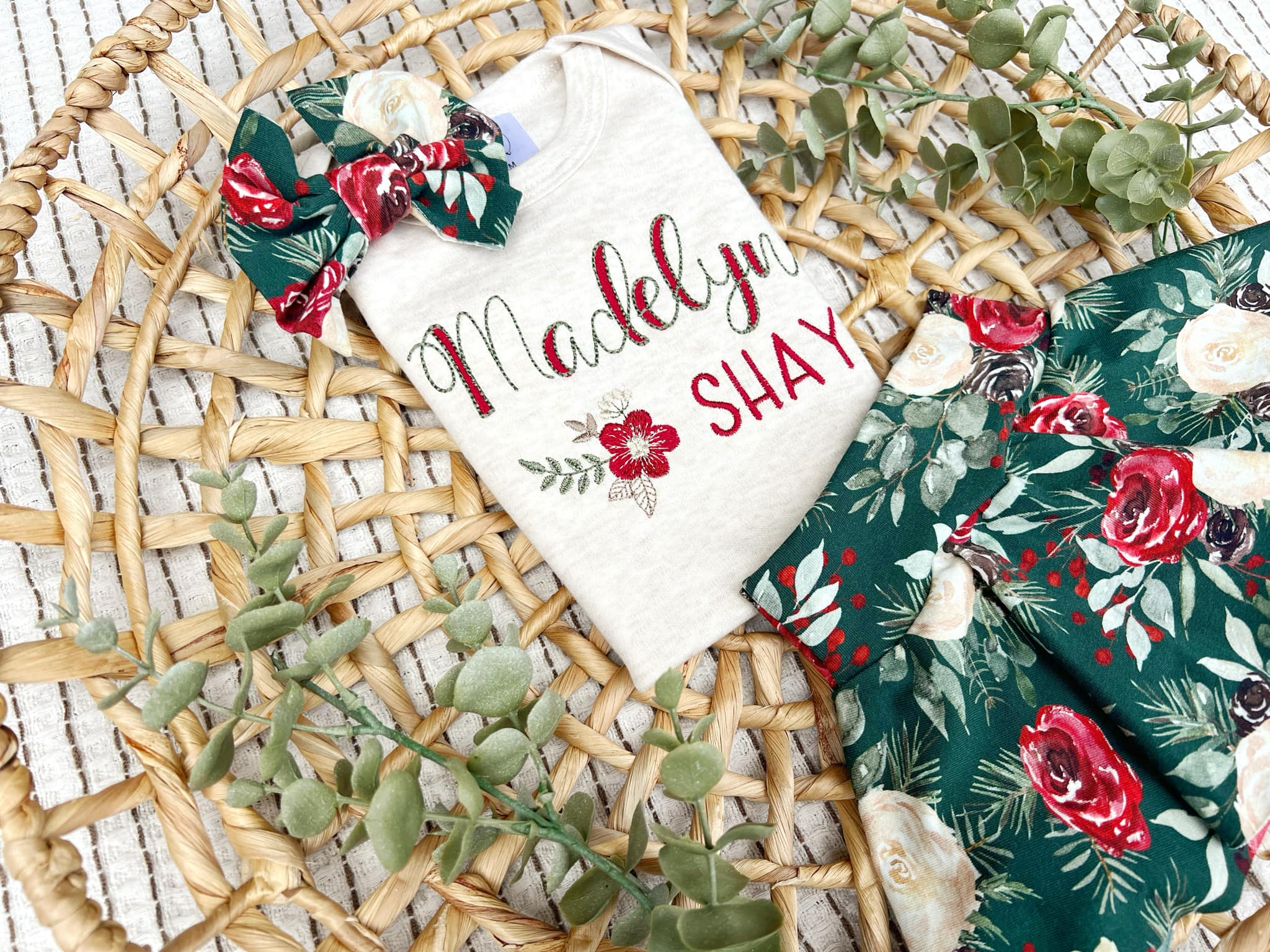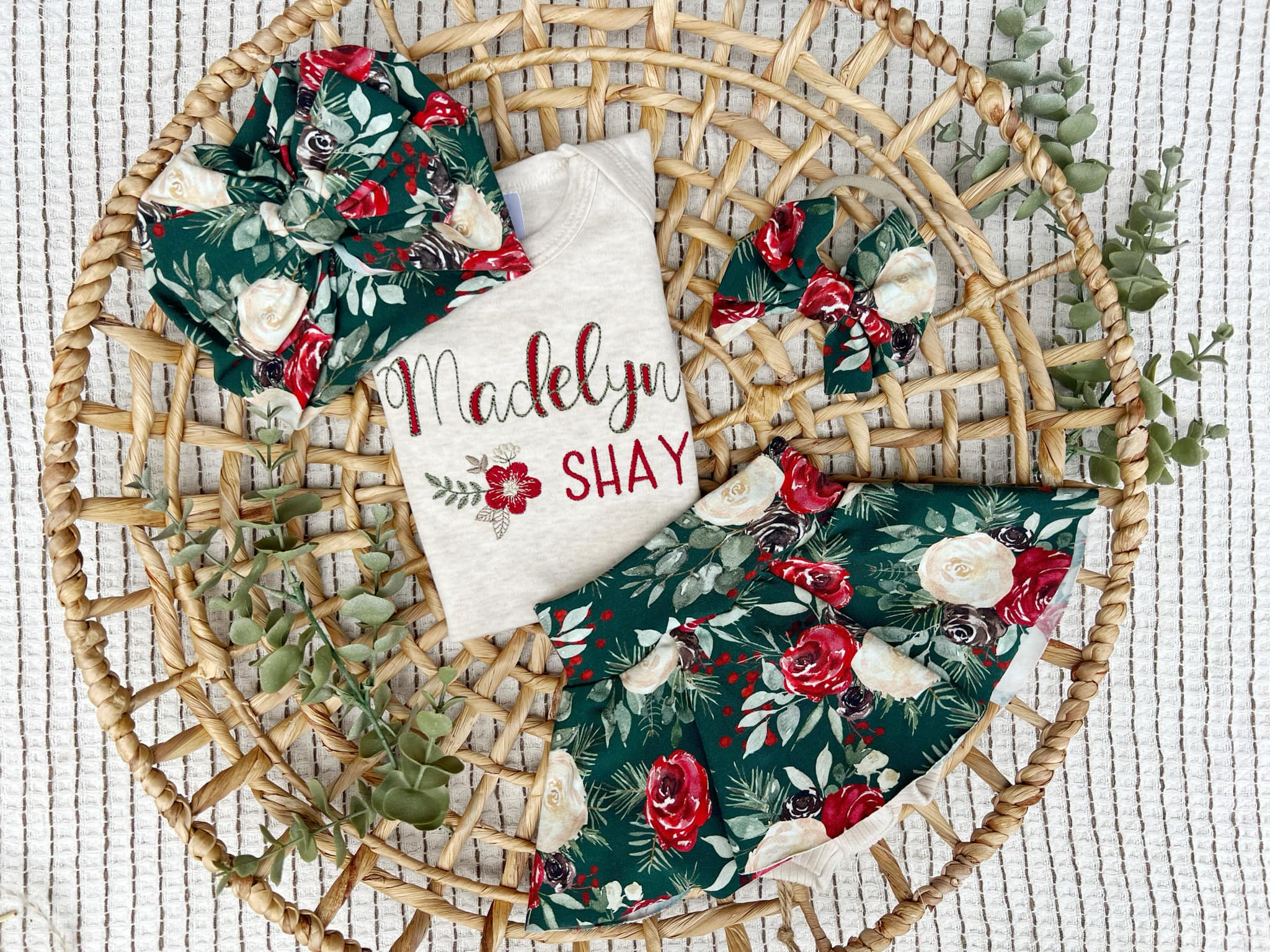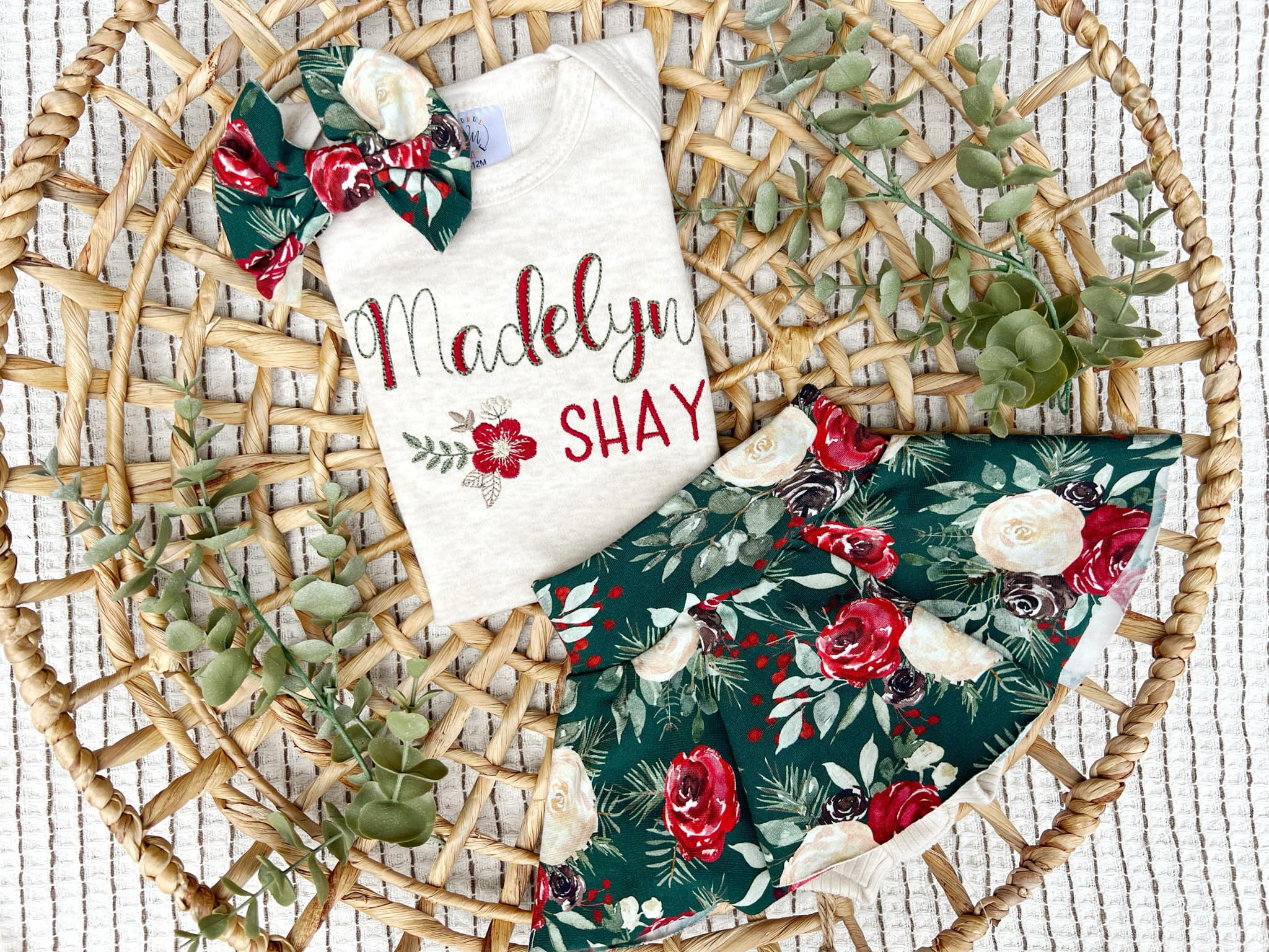 This is a perfect outfit for winter, spring, a coming home, birthday parties, and baby shower gifts. What a beautiful little outfit, perfect for showing off your sweet little wildflower! Mix and match your favorite pieces to make the outfit you want! It features an oatmeal bodysuit with the name in a red and green name with a cute flower. Finish off the outfit with a bright floral skirt with attached bloomers!