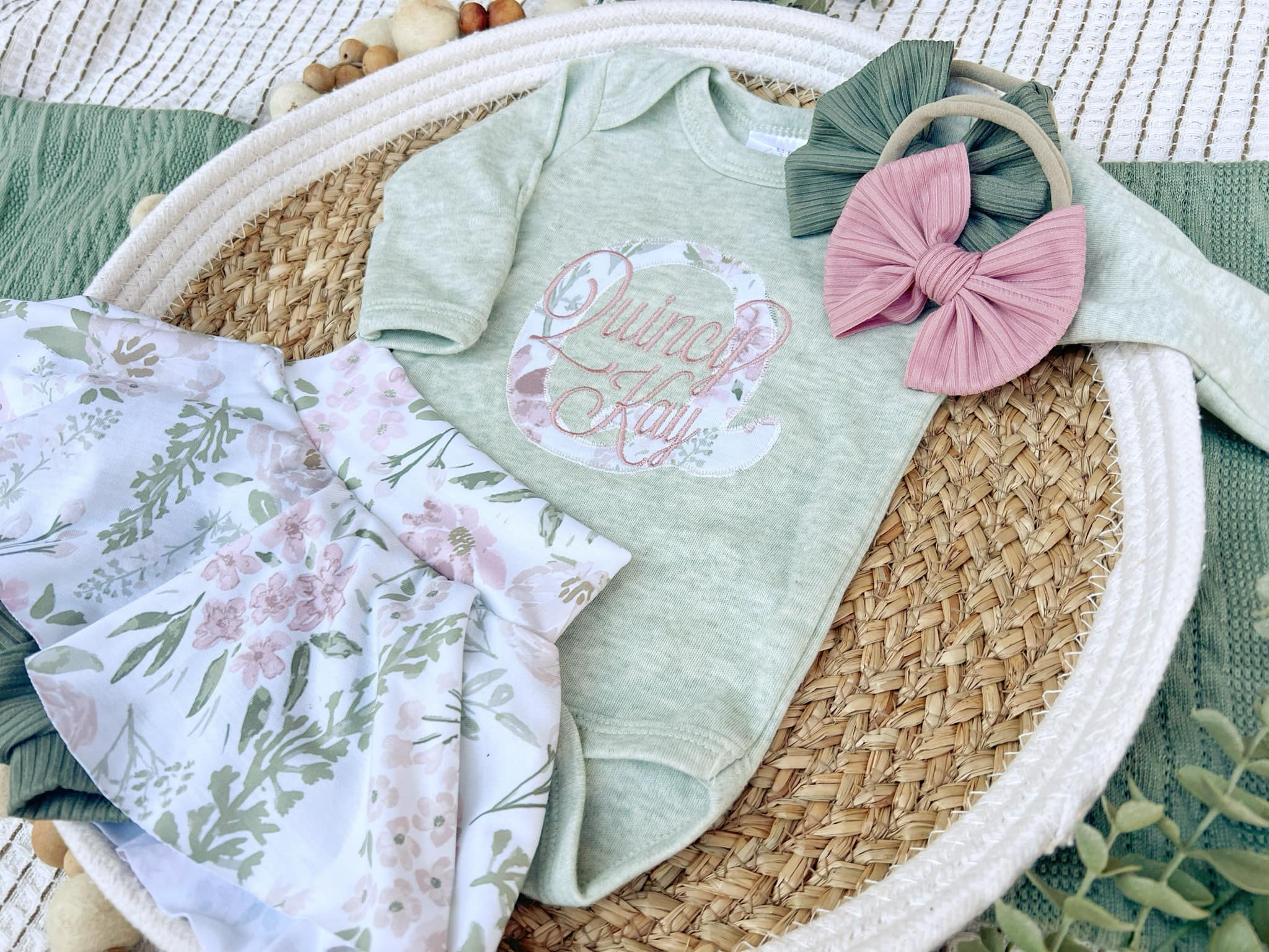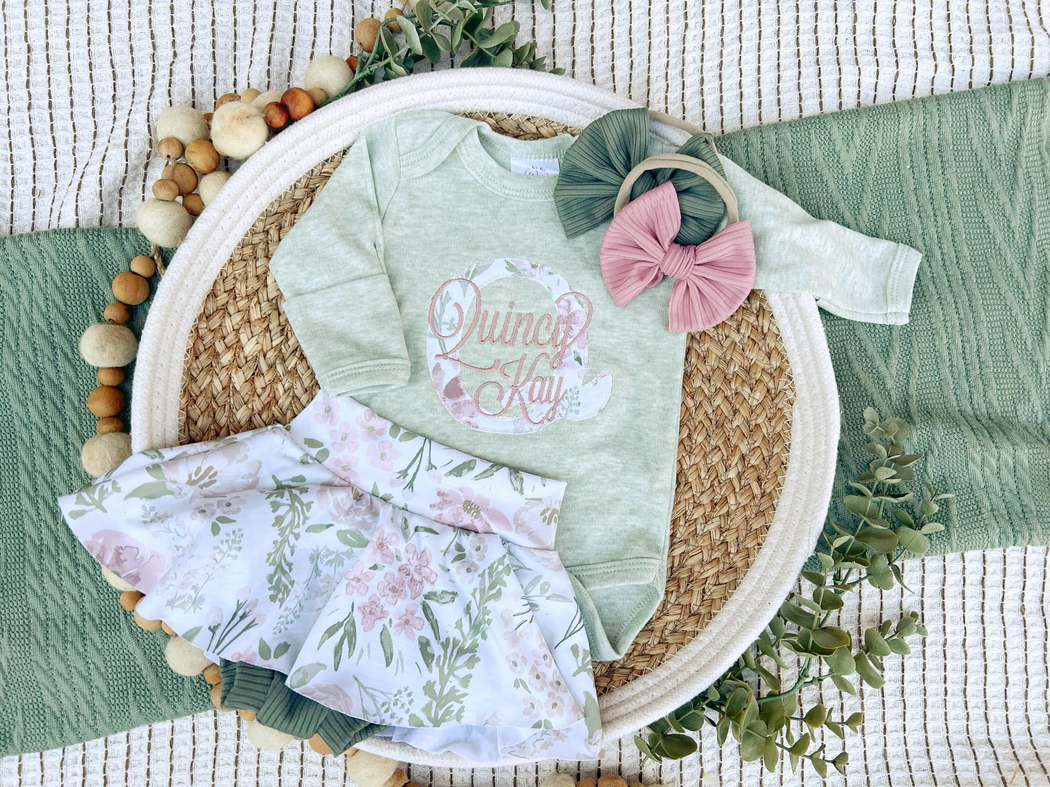 This is a perfect outfit for winter, spring, a coming home, birthday parties, and baby shower gifts. What a beautiful little outfit, perfect for showing off your sweet little wildflower! Mix and match your favorite pieces to make the outfit you want! It features a sage green bodysuit with the name in a pink name with a cute floral letter. Finish off the outfit with a soft floral skirt with attached bloomers!