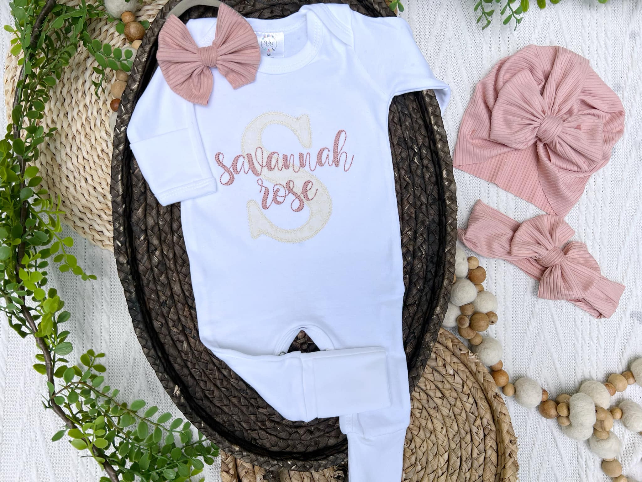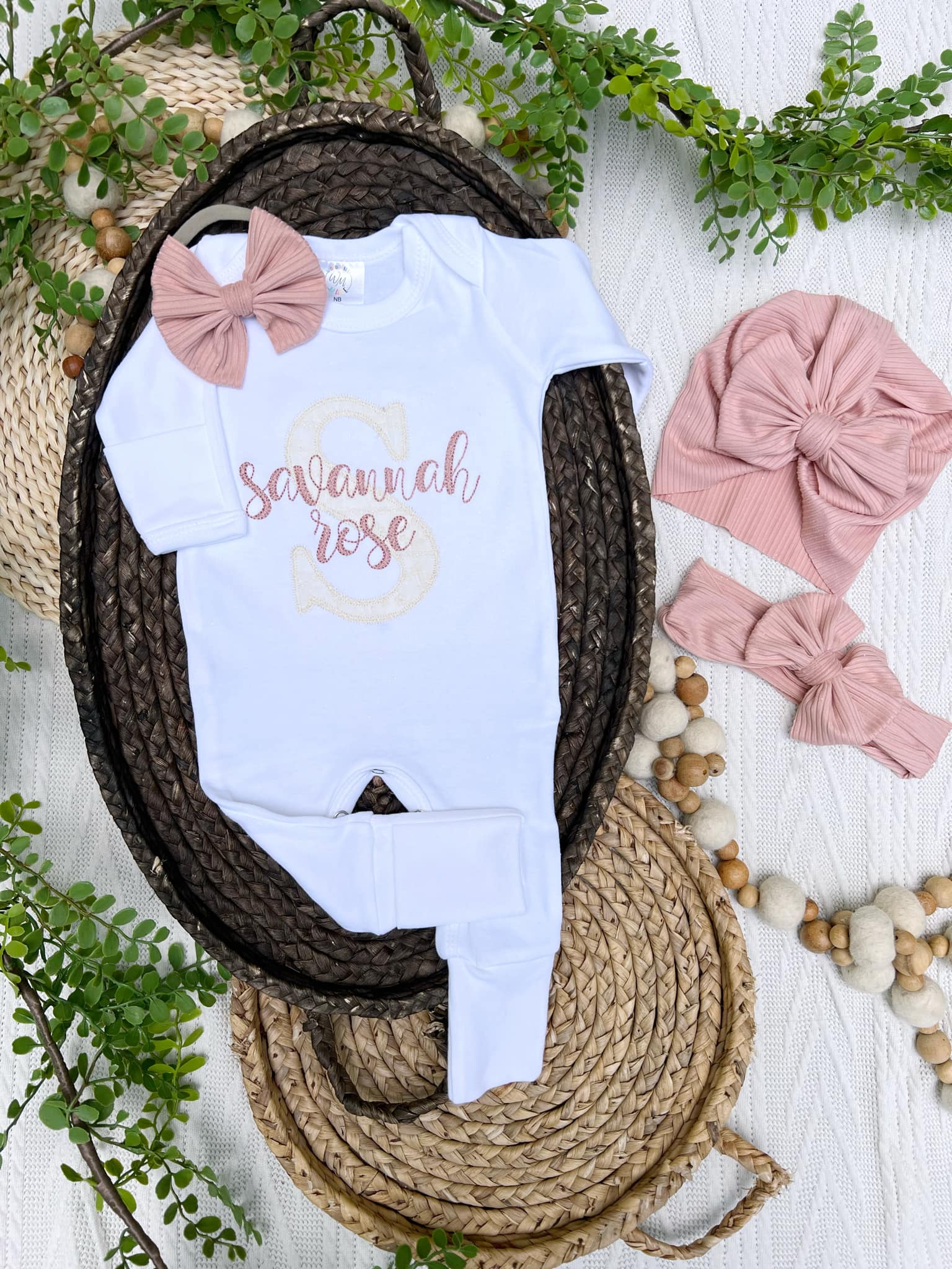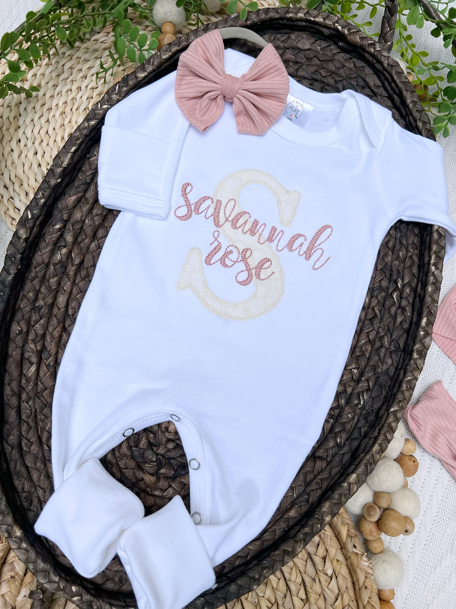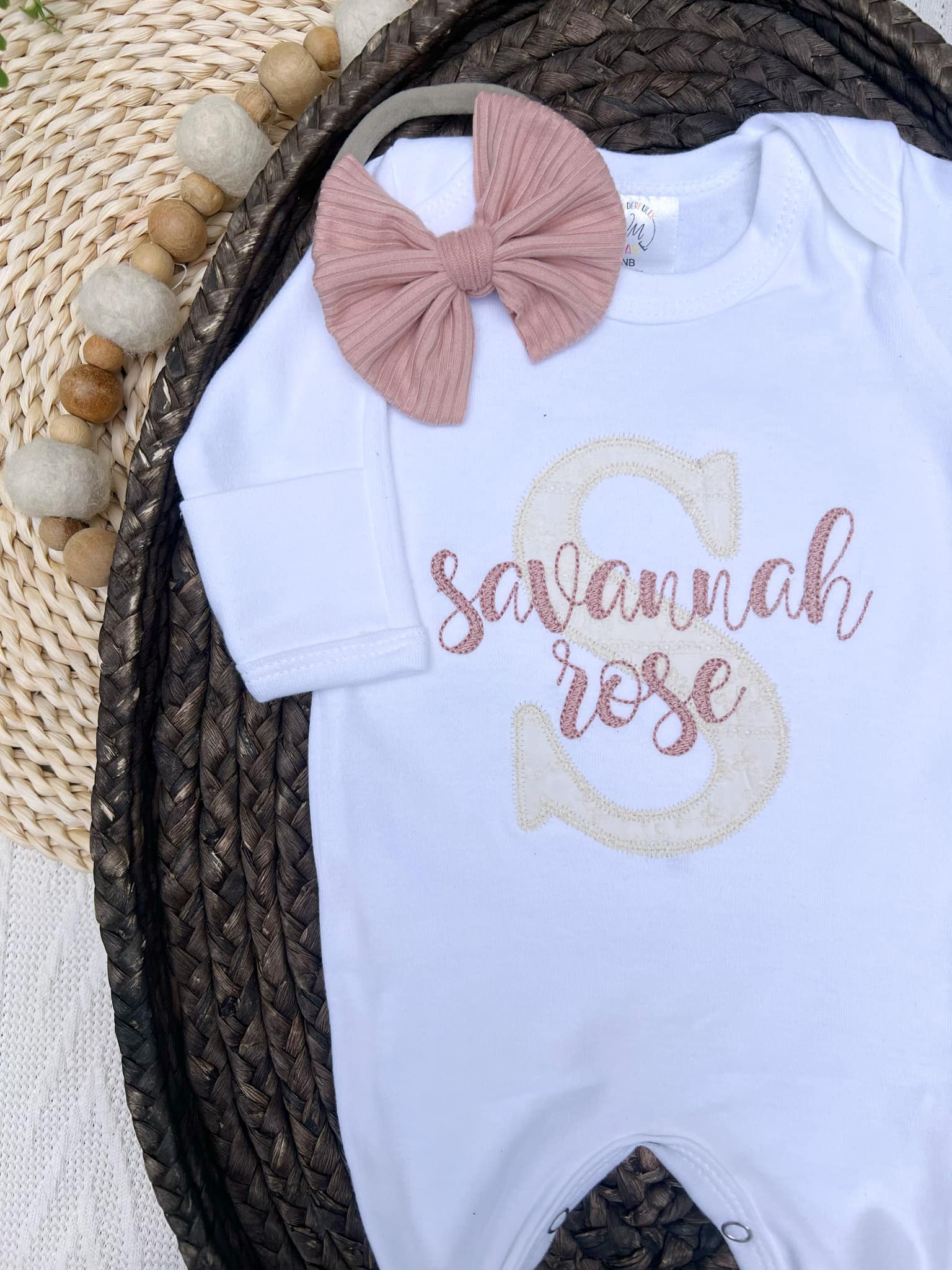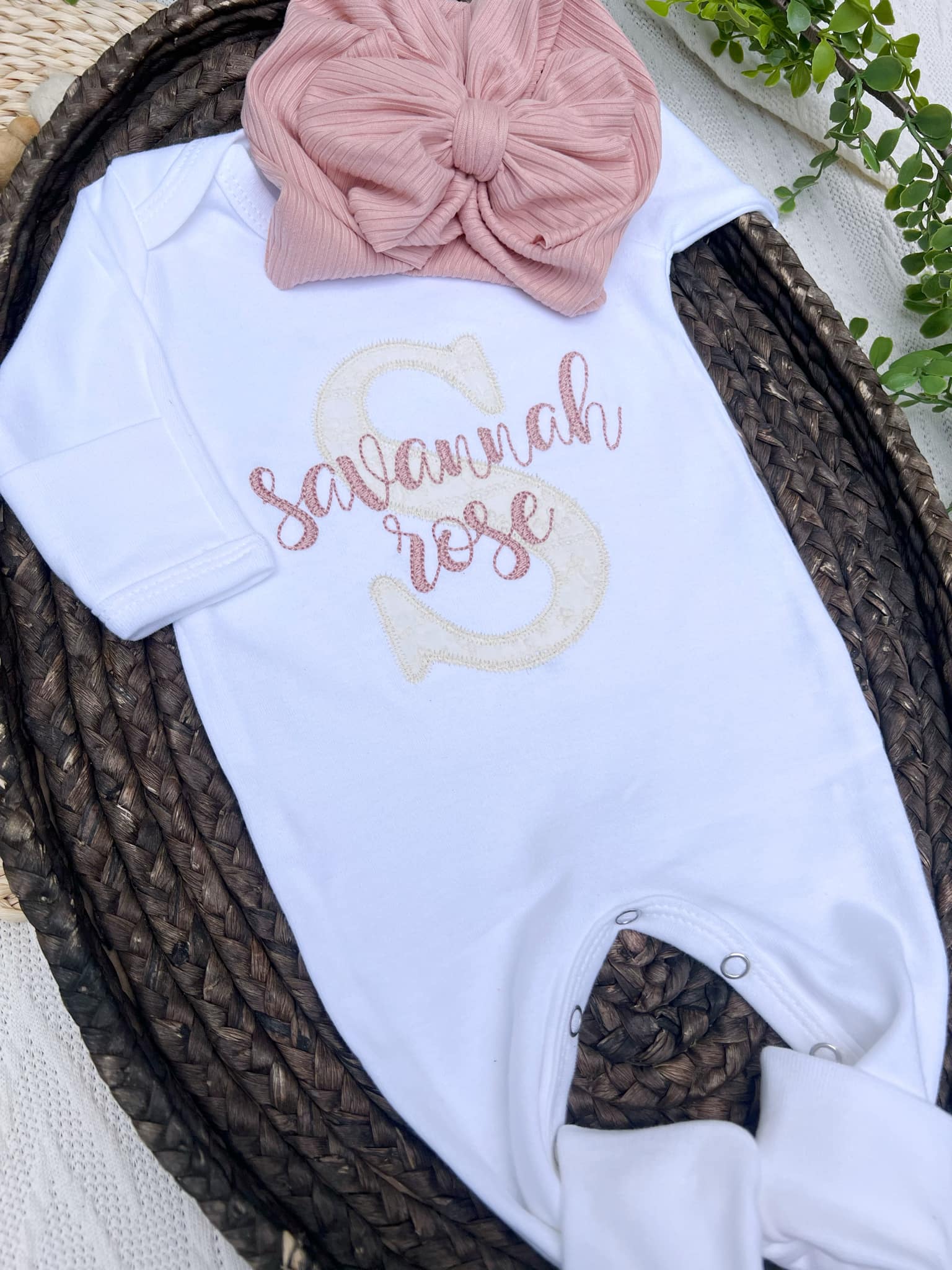 This sweet sleeper is soft and comfortable to snuggle a little one. This features a soft white romper with a large cream colored lace embroidered letter and name in a cute font in the name of your choice, and an option for a beautiful handmade bow. This outfit makes a perfect coming home outfit, newborn pictures, or baby shower gift.