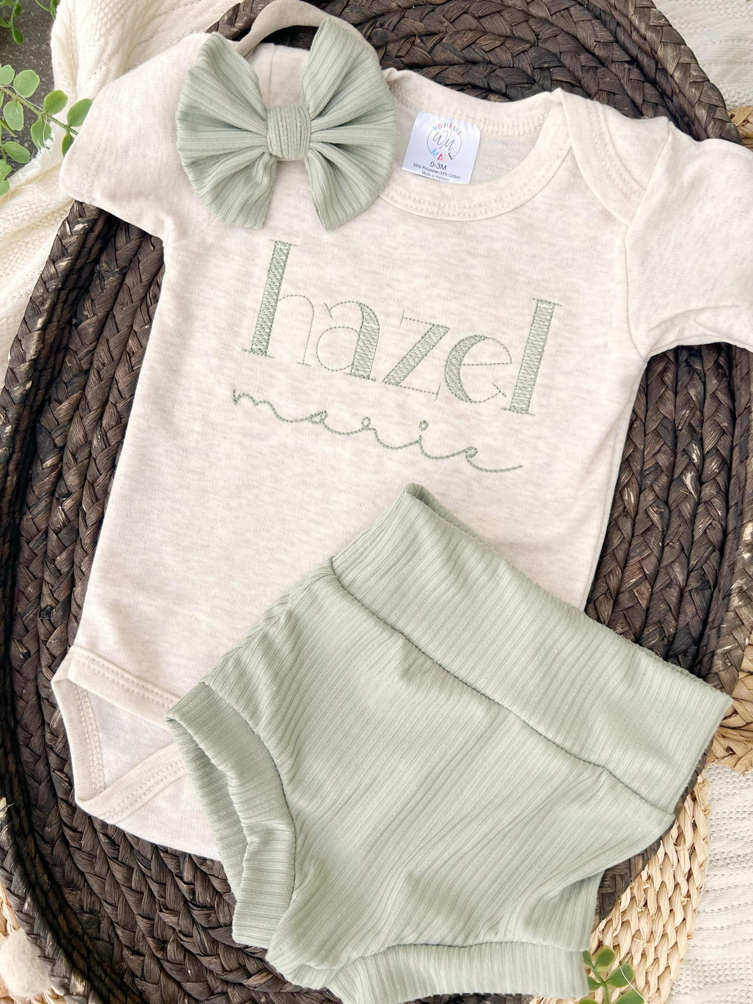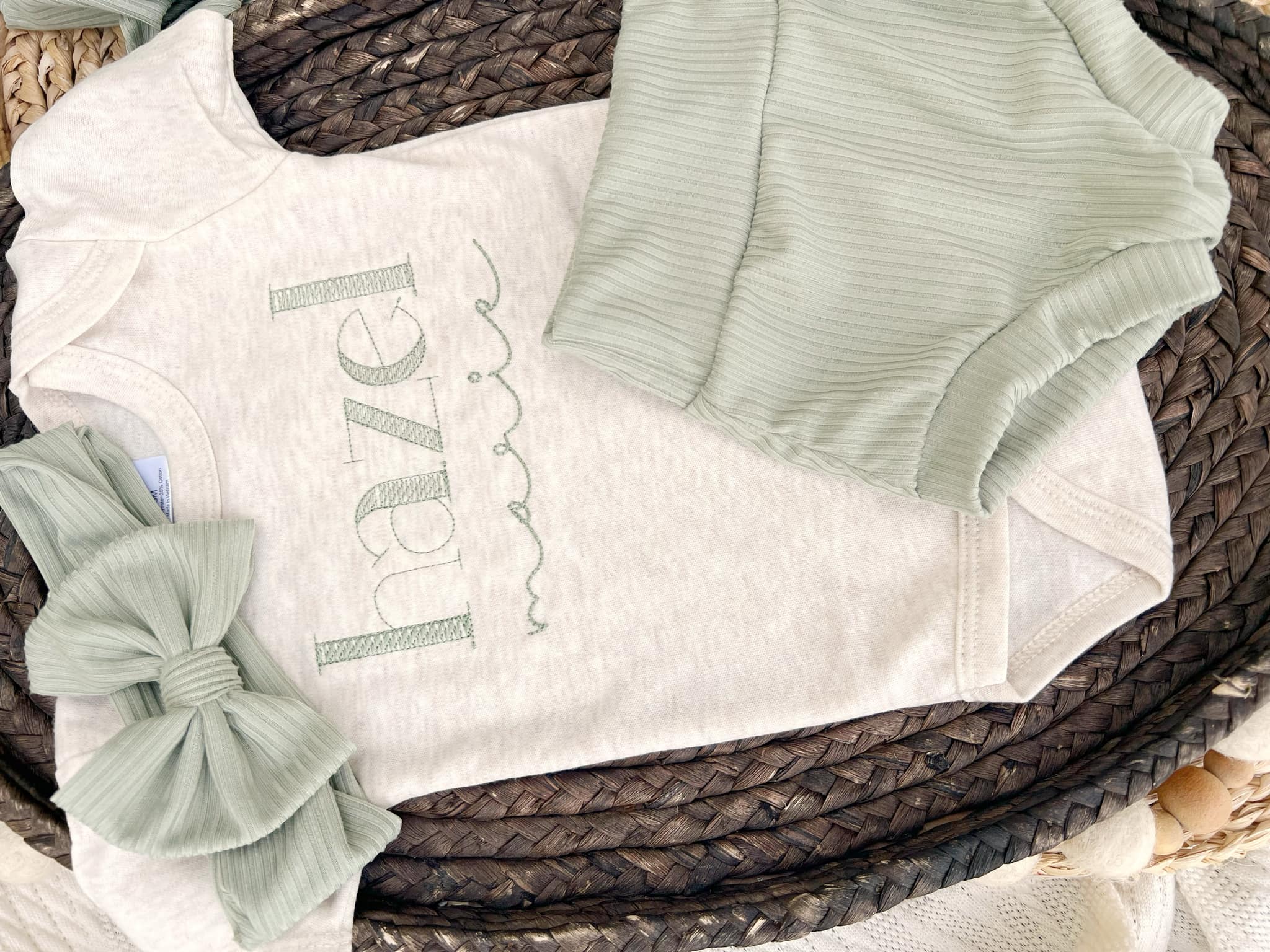 I am completely in love with this baby set! This sweet little oatmeal bodysuit is embroidered with a name stitched in a sage green thread. The matching bummies in sage are soft, stretchy, and so cute! The hand-tied bow is made in matching sage!