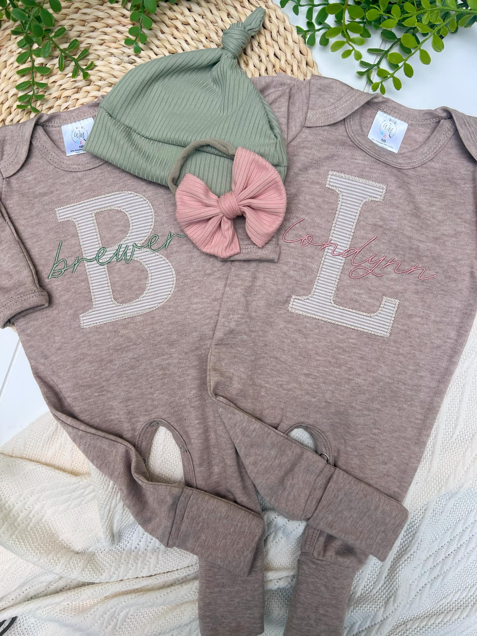 This outfit makes a perfect coming home outfit, newborn pictures, or baby shower gift. This classic set is perfect for twins! This features a soft mocha brown romper, a large initial in a timeless beige stripe, with name in a pink or green across the front. You can also choose to add a hat or turban to finish off these cute baby outfits. This sweet sleeper is soft and comfortable to snuggle new little ones.
